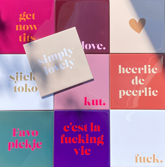 Kies je voor eenvoudig spreuken in wit/beige zoals 'Simply Lovely of Sjieke toko' of ga jij voor uitgesproken in terra of paars met 'Heerlie de Peerlie' of 'Get now tits'?